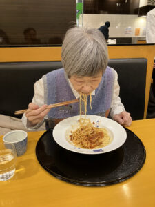 何か思い出はありますか?と問いかけると「子供の頃は今の様にスパゲッティの種類は沢山なくて、ミートソースかナポリタンしか無かったの」「私はミートソースの方が好き」「ほかの種類も食べてみたいけど、冒険して失敗するくらいなら、小さい頃よく食べていたミートソースがいいわ」と話されました。
