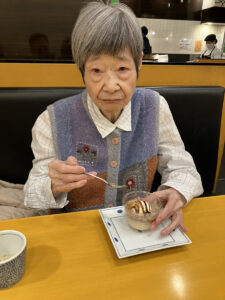 季節のスイーツのデザートセットがあったので「デザートも食べますか」とお声掛けすると、「勿論食べます!どれにしようかなぁ」とニコニコ。選ばれたのはなんと、キャラメルモンブランプリンバニラアイス添え!「凄いの行っちゃいましたね!」と笑いながら話すと「栗は大好きだからぜんぜん大丈夫」と満面の笑みで答えられました。